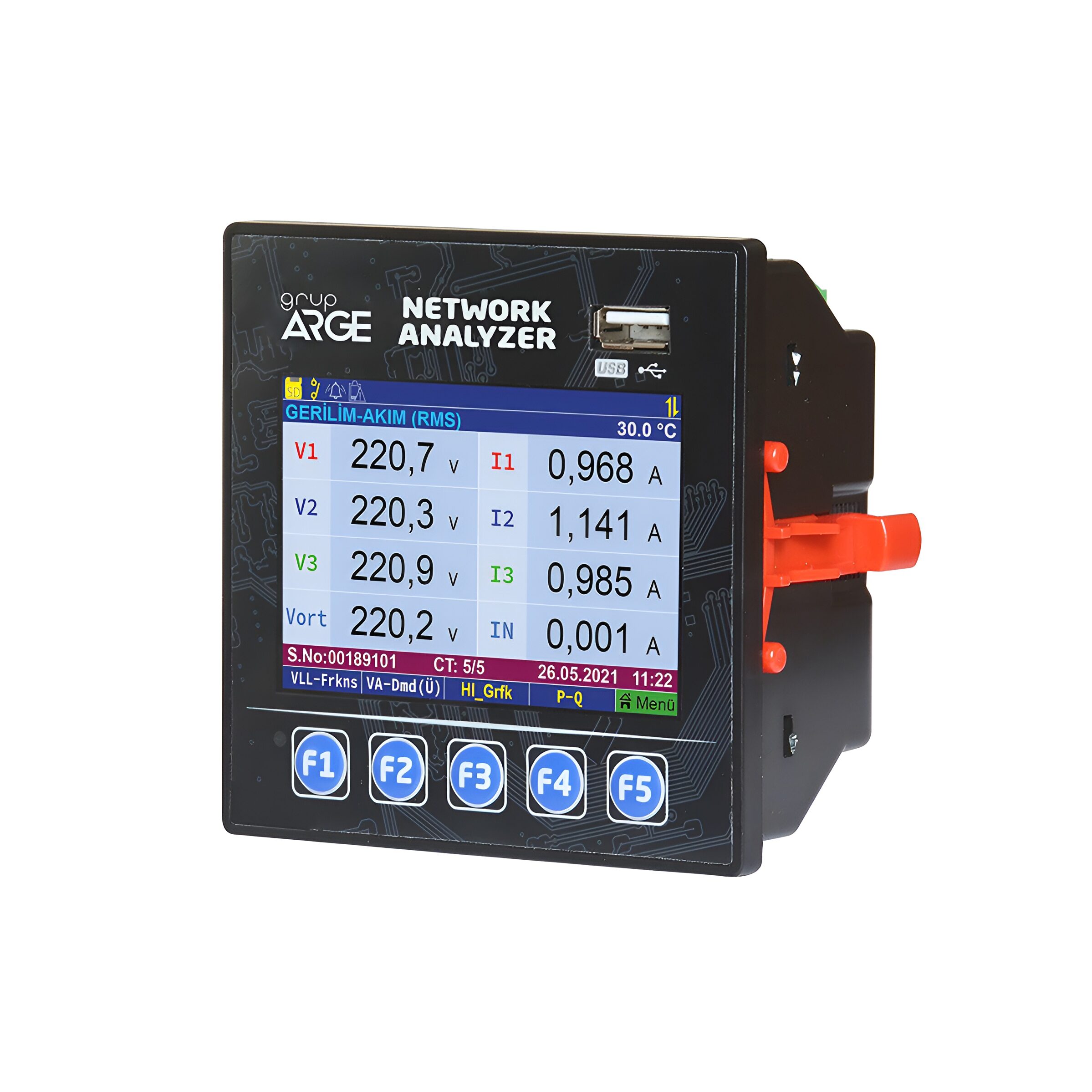 Network analyzer: Current and neutral current of 3 phases, phase-neutral and phase-phase voltages, frequency, active and reactive powers, angle difference between current and voltage, power factor and current and voltage harmonics between 1-63 of each phase and current and voltage Total Harmonic Distortion values can be measured and monitored on the screen. With it, it reads and records active and reactive energies.